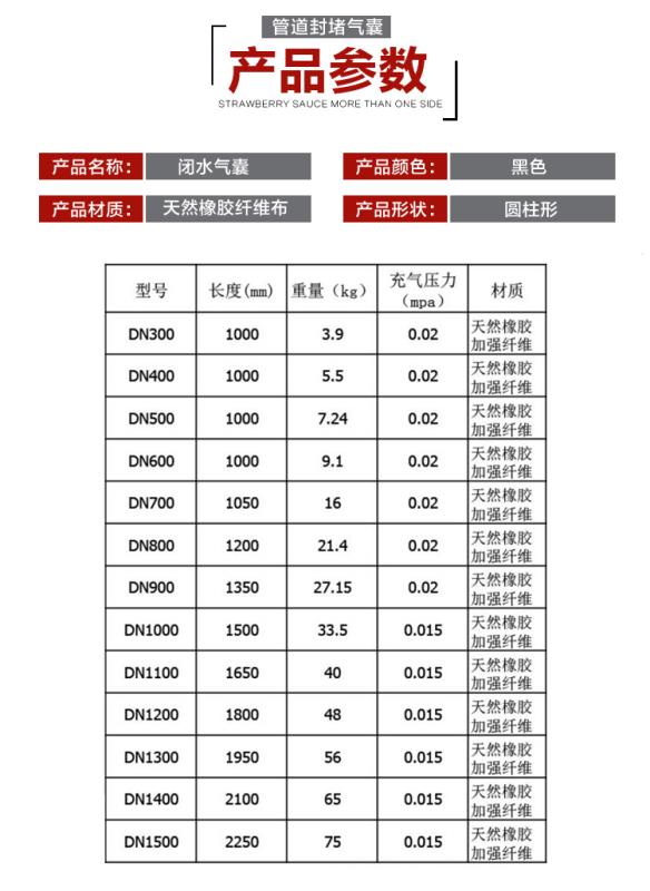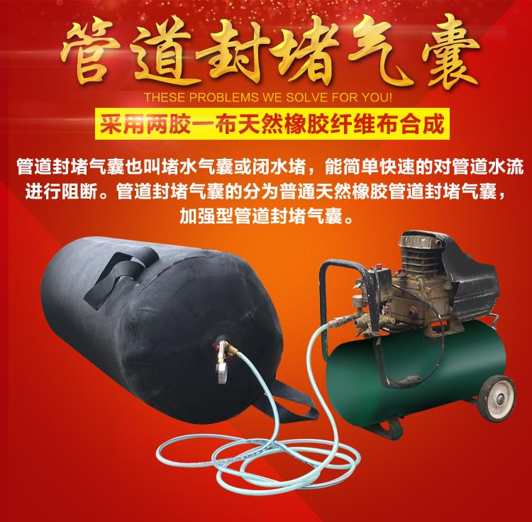 堵水氣囊也稱管道封堵氣囊(Water shut-off airbag)、閉水氣囊、封堵氣囊、充氣管塞,是橡膠和纖維織物等高分子合成材料經高溫硫化工藝製成的一種多規格、多形狀的用於管道、涵洞輸水、排汙、除淤維修的用橡膠產品,主要用於排水、汙水管道搶修、閉水試驗滲漏檢測,它可在不同管徑、不同平麵和不同位置上**阻斷水流,是地下管道進行輸排水和淤汙治理的理想工具。