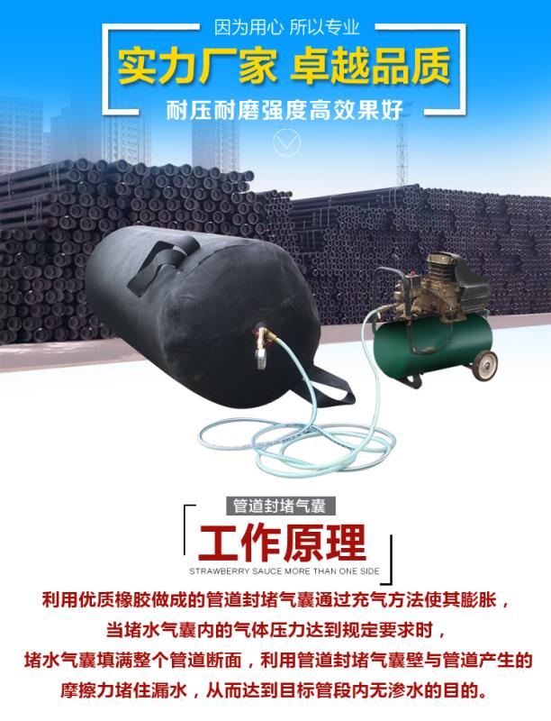 堵水氣囊也稱管道封堵氣囊(Water shut-off airbag)、閉水氣囊、封堵氣囊、充氣管塞,是橡膠和纖維織物等高分子合成材料經高溫硫化工藝製成的一種多規格、多形狀的用於管道、涵洞輸水、排汙、除淤維修的用橡膠產品,主要用於排水、汙水管道搶修、閉水試驗滲漏檢測,它可在不同管徑、不同平麵和不同位置上**阻斷水流,是地下管道進行輸排水和淤汙治理的理想工具。